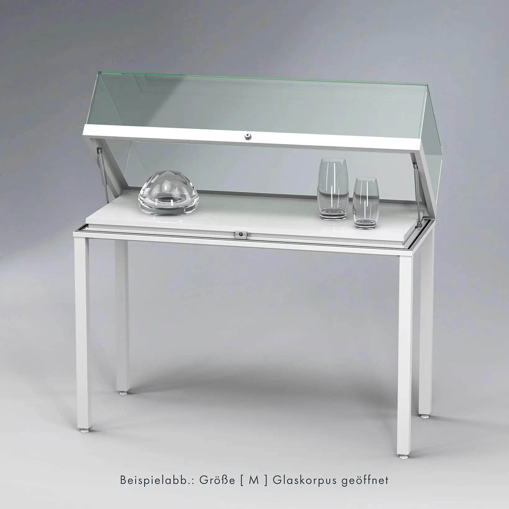 - Glaskorpus Öffnung nach oben klappbar, unterstützt und gehalten durch Gasdruckfedern