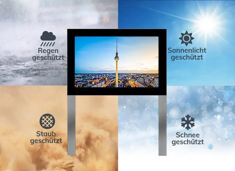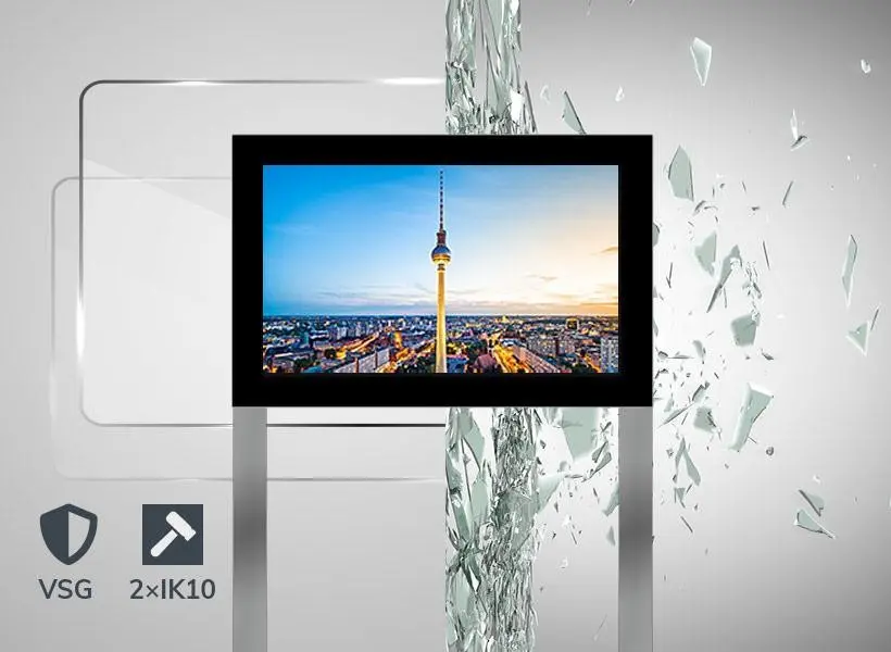 e.Vitrum® Monitorvitrine Outdoor - einseitig Größe: 861 x 2245 x 205 mm B x H x TOberfläche: E2-C31 NIROXDisplay 55" LCD-Panel, Full HD 1080 x 1920 Pixel, 24/7 BetriebHelligkeit 2500 cd/m², inkl. HelligkeitssensorSichtmaß 681 x 1210 mmAbmessung Flügel 861 x 1445 mmÖffnungsart KlappflügelÖffnungswinkel 70°Verschluß Sockel Profilzylinder frontseitig, DIN LSVerschluß Display 6-Kant Getriebeverriegelung mit ServiceschlüsselVerglasung Chemisch entspiegeltes 9,14mm VSG Sicherheitsglasmit IR und UV Filter im Scheibenzwischenraum. DieSchutzscheibe wird im zertifizierten Dow Corning Verfahren dauerhaft aufgebrachtPassepartout Keramisch bedruckt, RAL 9005, SchwarzAusführung Hochwertige Aluminiumkonstruktion aus EN AW 6060.Blendrahmen mit Kantenradius R 3 und Flügelrahmen in flächenbündiger KonstruktionStandbeine/ Aufbau Innen liegende Stahlkonstruktion mit Fußplatten, 150 mm unter OKFFRückseite Geschlossen mit einem AluminiumblechKlimatechnik Integrierte Lüfter-Technik sowie Temperatur gesteuertesHeizsystem. Temperaturbereich - 33° C bis + 40° CSchutzklasse IP 65 Gehäuse | IP 54 KlimabereichZubehör 2 Stk. Steckdosen, Befestigungsmaterial, Sicherungselemente,Potentialausgleich, Outdoor-Kabeleinführung